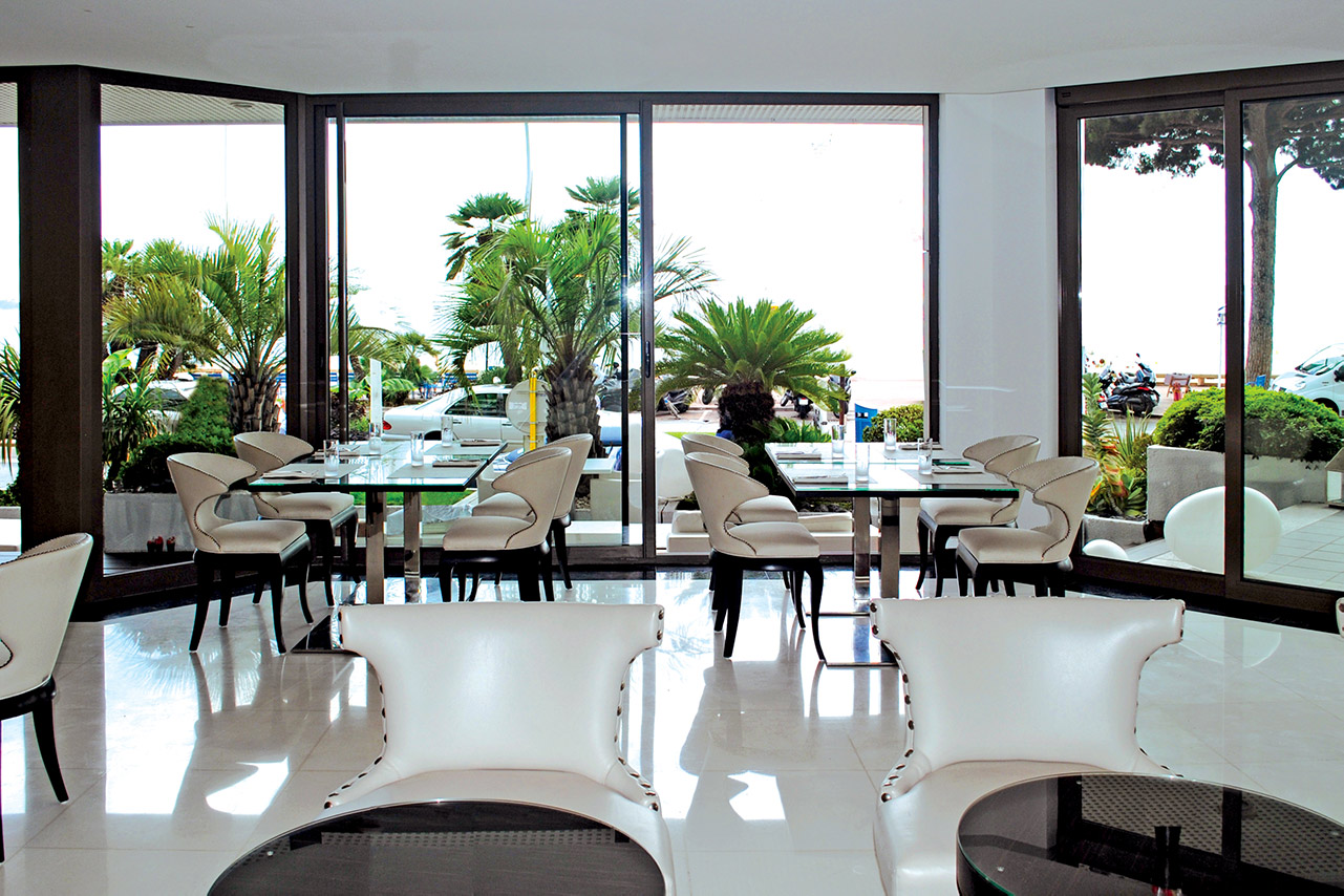 A pretty bistrot inside the Marriot Hotel in Cannes, carachterised by the combination of differently shaped chairs, which create a perfect equilibrium.