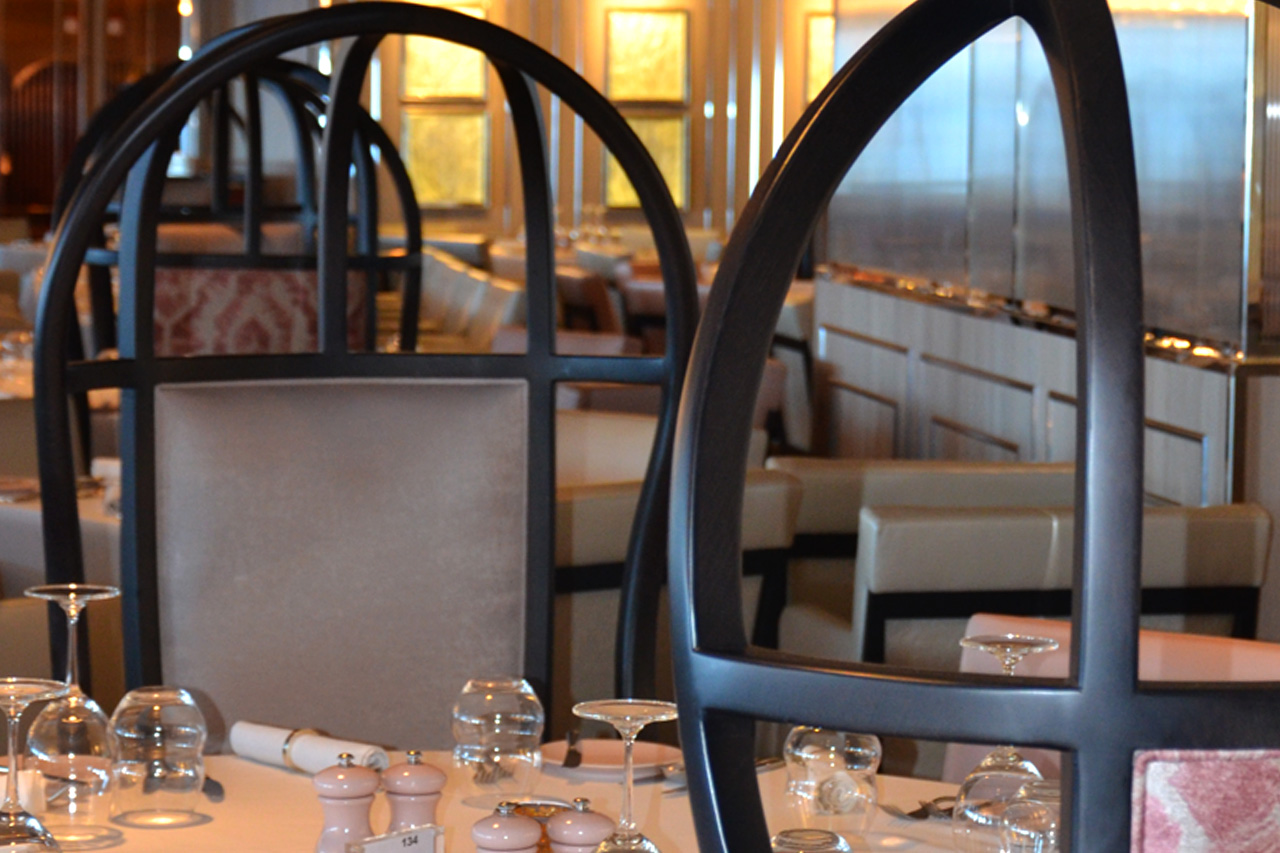 Our CUPOLA ARIA high back chair, with its beautiful wooden frame and pretty upholstery, does certainly stand out and is used as an accent seat in this lovely NORMANDIE restaurant onboard Celebrity Edge cruise line by Royal Caribbean.