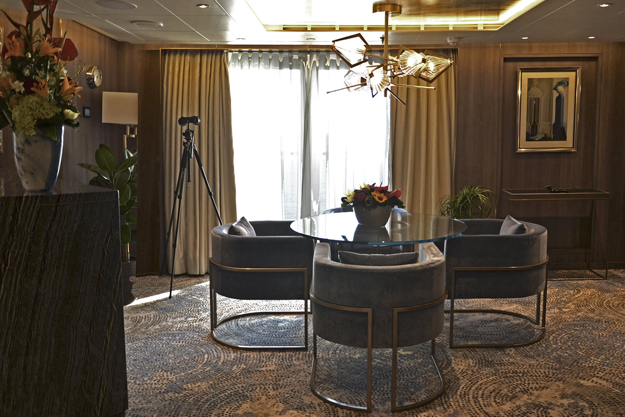 A presidential suite onboard NIEUW STATENDAM by HOLLAND AMERICA CRUISE LINE Metal and plush fabrics are combined in a exquisite and elegant style