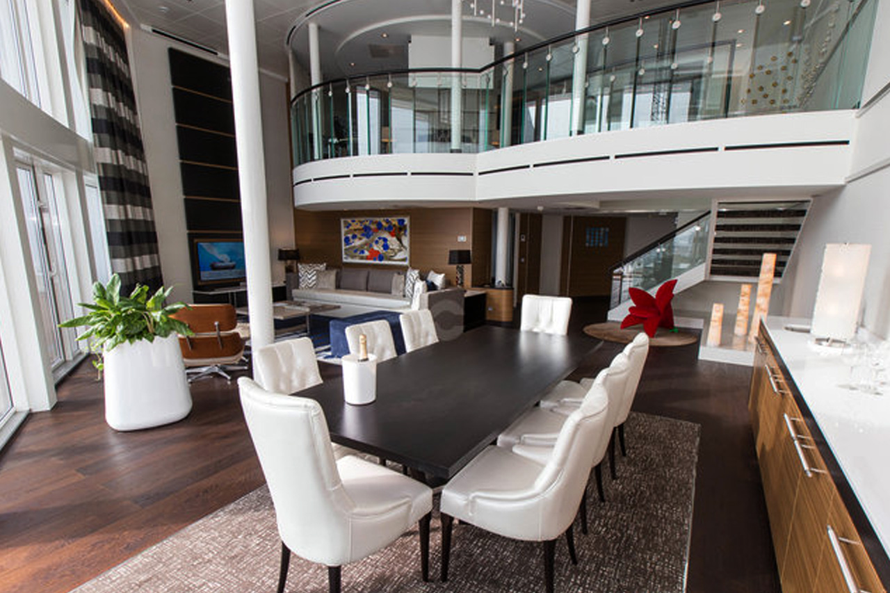 Our 828/AC chairs have been selected for the SUITES onboard the QUANTUM class cruise lines by Royal Caribbean. Four in the same back height for the Junior Suites and 6+2 at the head of the table with a higher back for the Presidential Suites. All upholstered in a soft cream leather. Blue leather has been used for the anteroom to the sleeping area.828 AC