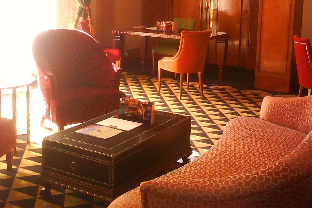 A classic set up for this room with important drapes, crystal chandeliers and a geometric, marble floor. The orange upholstery for our seats goes well with the rich cherry shade of our 748 wooden table and with the impressive studded trunk used as a table.828 AC MR BEAN PANDORA
