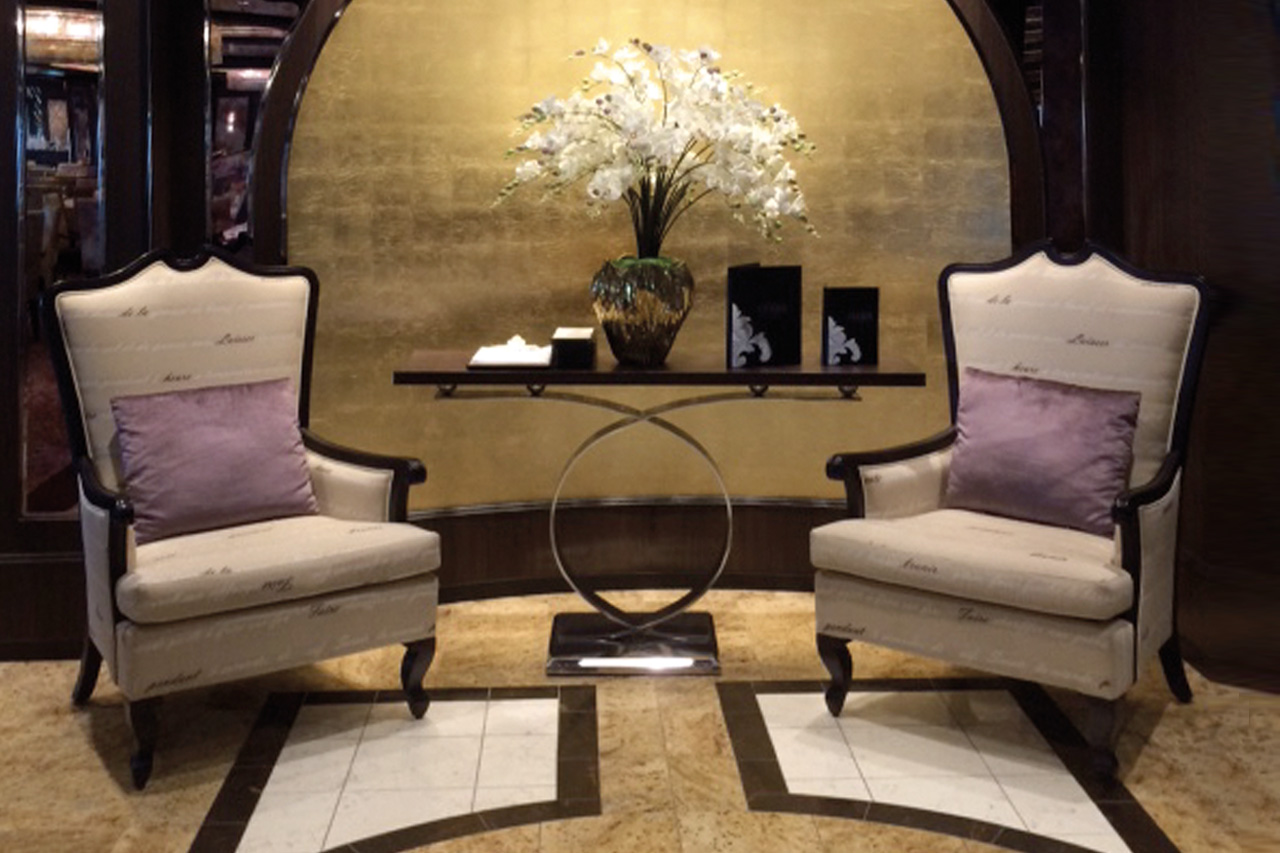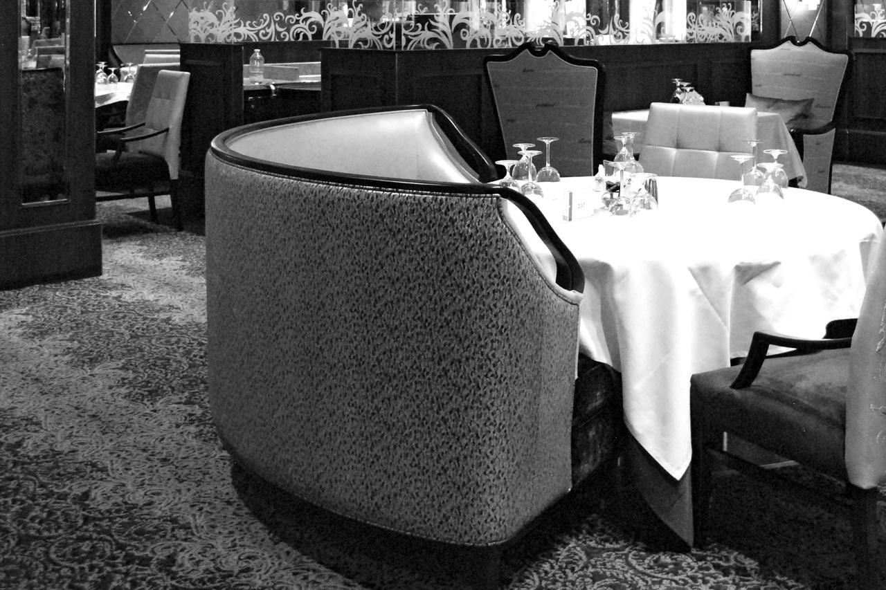 A restaurant resembling the ones found on transatlantic vessels at the beginning of the Century, with soft velvets, luxury printed leathers, and wood paneling in mowing glass and mahogany. Our DAISY bench is teamed with our RECIPE armchair upholstered in a custom fabric specifically made for this project.MAJESTIC RECIPE